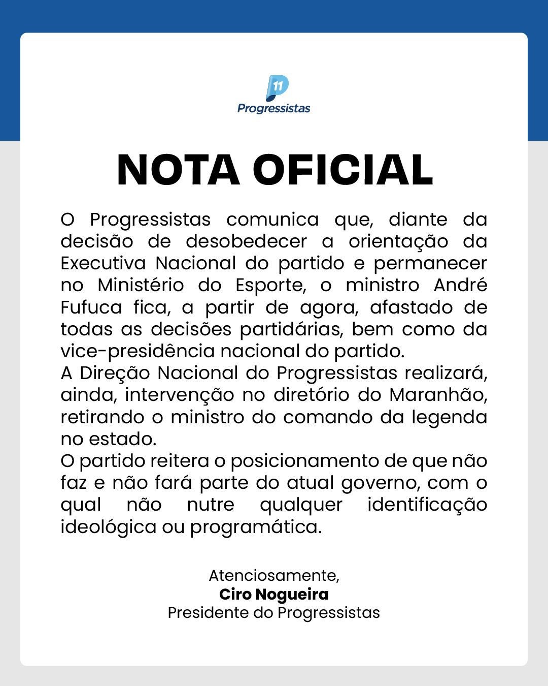 O presidente nacional da legenda, senador Ciro Nogueira (PI), já havia indicado que não pretende expulsar o ministro. Fufuca é aliado de Nogueira e teve liberdade para negociar espaço no governo Lula ainda durante seu início de mandato.