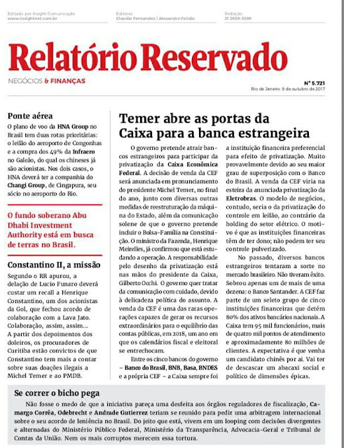 Entre os cinco bancos do governo – Banco do Brasil, BNB, Basa, BNDES e a própria CEF – a Caixa sempre foi a instituição financeira preferencial para efeito de privatização. Muito provavelmente devido ao seu maior grau de superposição com o Banco do Brasil. A venda da CEF viria na esteira da anunciada privatização da Eletrobras. O modelo de negócios, contudo, seria o da privatização do controle em leilão, ao contrário da holding do setor elétrico. O motivo é que as instituições financeiras têm de ter dono; não podem ter seu controle pulverizado.