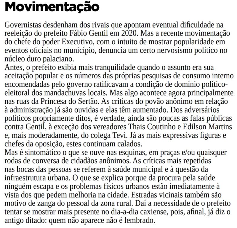 Pesquisa recentes mostra a viabilidade da candidatura da deputada Cleide Coutinho à prefeita de Caxias e a possibilidade real de vitória. Segundo o levantamento encomendado por um partido político, numa eventual disputa entre o prefeito Fábio Gentil e a deputada Cleide Coutinho, o mandatário municipal alcança 40% dos votos contra 35% da adversária. Assim que anunciar o desejo de ser candidata, Cleide Coutinho não demorá a assumir a liderança das pesquisas. Outro dado importante da pesquisa é que a união de Cleide Coutinho (35%) e Paulo Marinho Jr. (20%) definiria a eleição em Caxias.