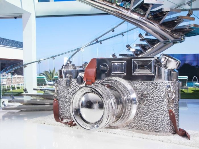 Para adornar os pés da escada, uma enorme escultura de uma máquina fotográfica Leica feita em aço inoxidável pelo artista Yibai Liao