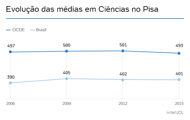 Em ciências, quando são avaliadas a capacidade de lidar com conceitos, teorias, procedimentos e práticas associadas à investigação científica, o Brasil contabilizou média de 401 pontos, valor também inferior ao dos estudantes dos países membros da OCDE (493). Em relação ao Pisa anterior (2012), a média (402) não mostrou grande diferença. O país seguiu estagnado, já que a variação foi de apenas 1 ponto.