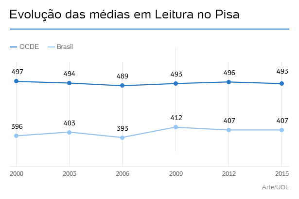 A pontuação do Brasil foi de 407, enquanto que os países da OCDE tiveram uma média de 493. A média brasileira foi a mesma de três anos atrás, na última edição do Pisa.