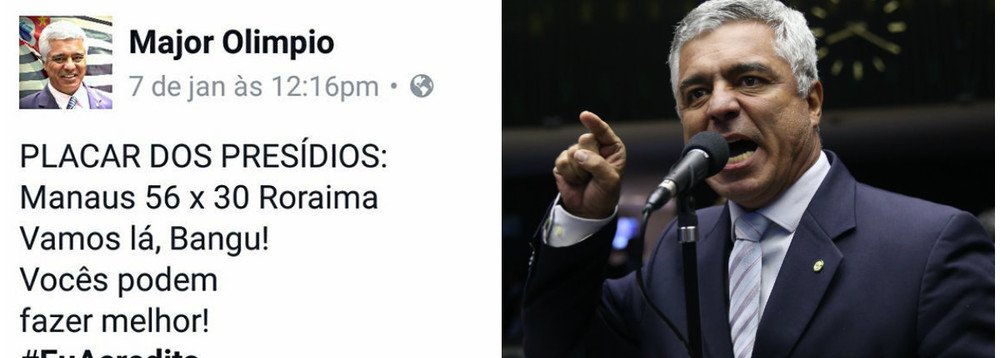 Depois do secretário de Juventude de Temer, que pediu “uma chacina por semana” e deixou o cargo no mesmo dia, o deputado federal Major Olimpio (SD-SP) faz apologia ao crime ao desafiar o presídio de Bangu, no Rio de Janeiro, a “fazer melhor” que Manaus e Roraima; “PLACAR DOS PRESÍDIOS: Manaus 56 x 30 Roraima. Vamos lá, Bangu! Vocês podem fazer melhor! #EuAcredito”, postou o parlamentar no Facebook