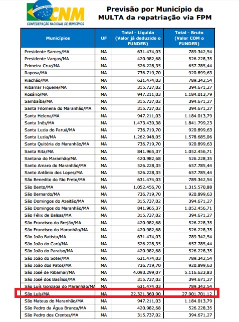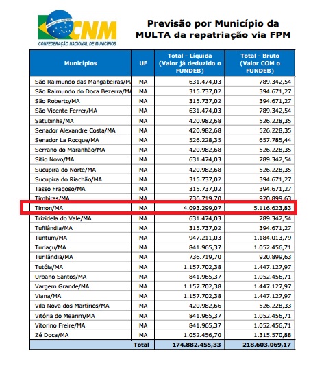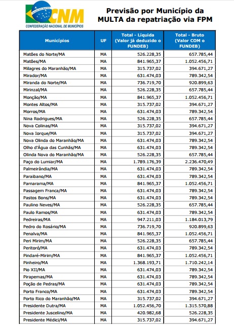 A informação do repasse para as contas das prefeituras brasileiras, foi enviada aos gestores pela CNM, na sexta-feira (6). O montante previsto será de R$ 2.369.090.905,86, já descontada a retenção do Fundo de Manutenção e Desenvolvimento da Educação Básica e de Valorização dos Profissionais da Educação (Fundeb).